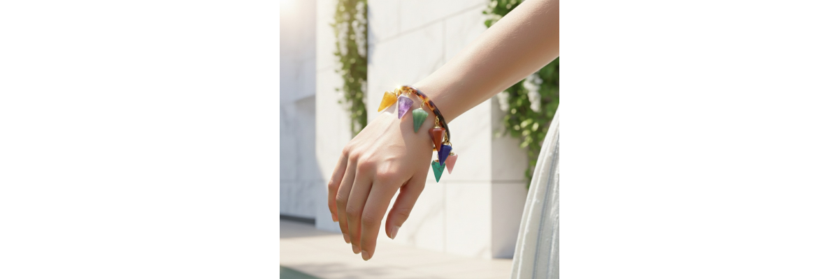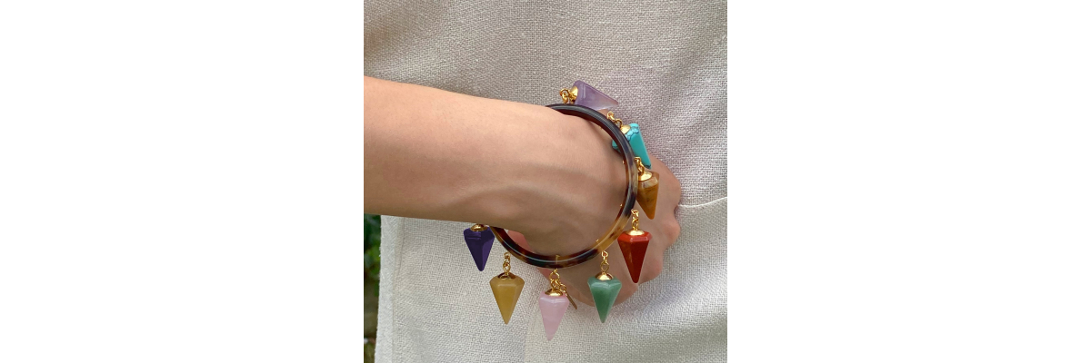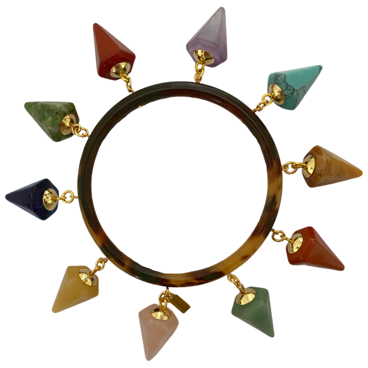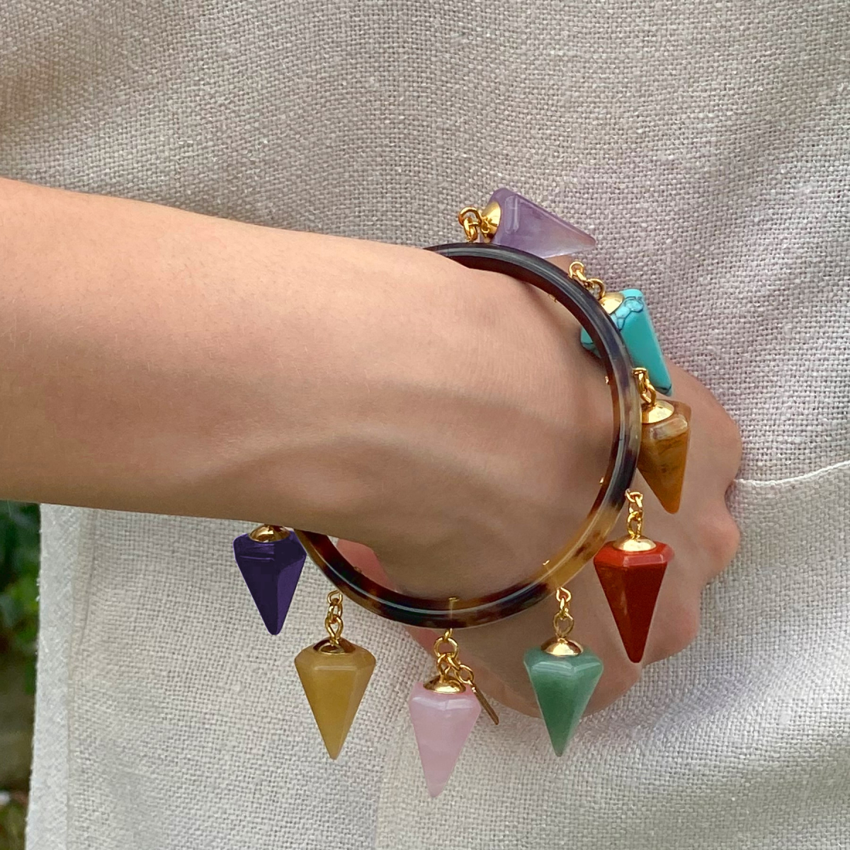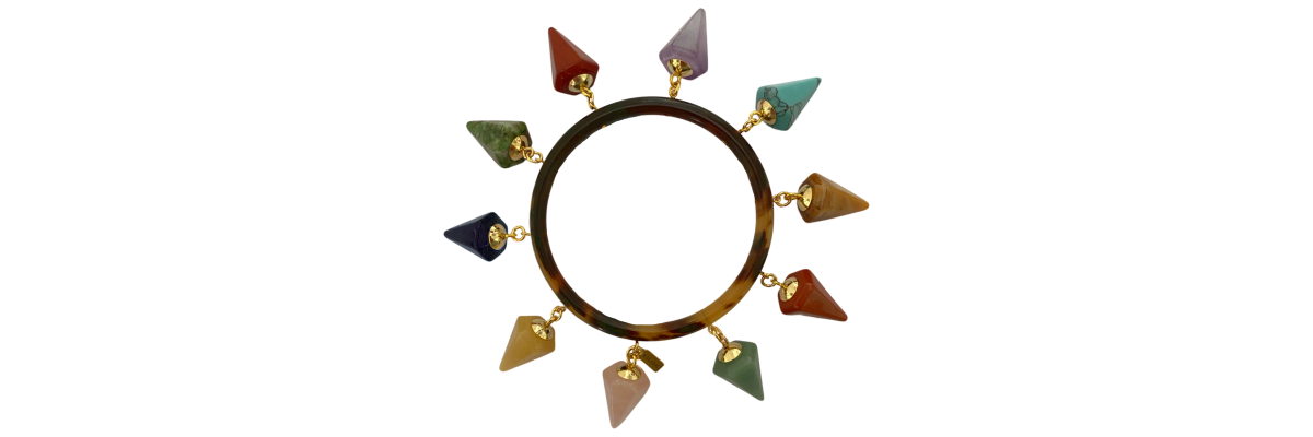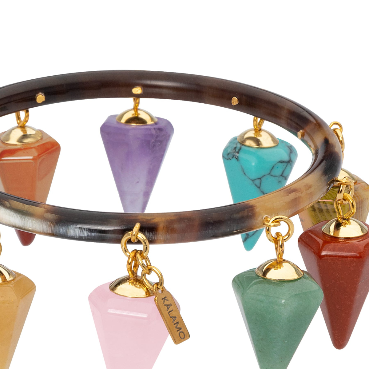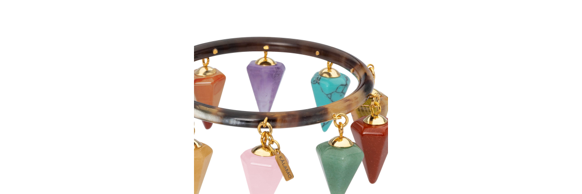 Pulsera Sofía rígida de cuerno con colgantes en forma de pirámide de jaspe rojo, cuarzo rosa, unakita, amatista, turquesa, ágata... -Peso 43 g -Diámetro interior 6,2 cm -Metal: acero bañado en oro -Color; multicolor -Al ser materiales naturales y estar trabajados a mano, pueden variar ligeramente en tamaño, forma y color.