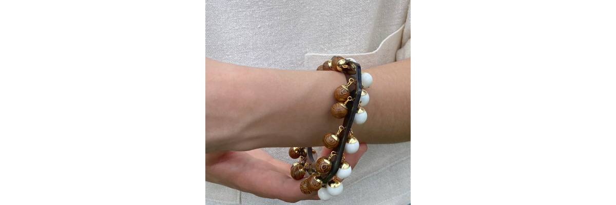 Pulsera Dante rígida de cuerno con cuentas de nácar por un lado y cuentas de madera de wengué por el otro. -Peso 52 g - Diámetro interior: 6,2 cm -Metal: acero bañado en oro -Al ser materiales naturales y estar trabajados a mano, pueden variar ligeramente en tamaño, forma y color.