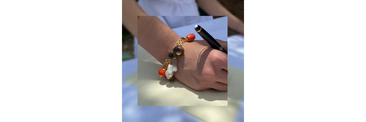 Pulsera rígida Bel con esmalte, y colgantes de coral, perlas barrocas, ébano y ágatas. -Peso 35 g -Longitud 18-20 cm -Metal: acero bañado en oro -Marrón/naranja/blanco -Al ser materiales naturales y estar trabajados a mano, pueden variar ligeramente en tamaño, forma y color.
