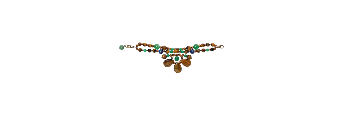 Pulsera Tricia con ojo de tigre, cristal de Bohemia, jade, ágatas y cornalina . -Peso 49 g -Longitud 19 cm -Metal: aleación dorado viejo -Marrón/azul -Al ser materiales naturales y estar trabajados a mano, pueden variar ligeramente en tamaño, forma y color.