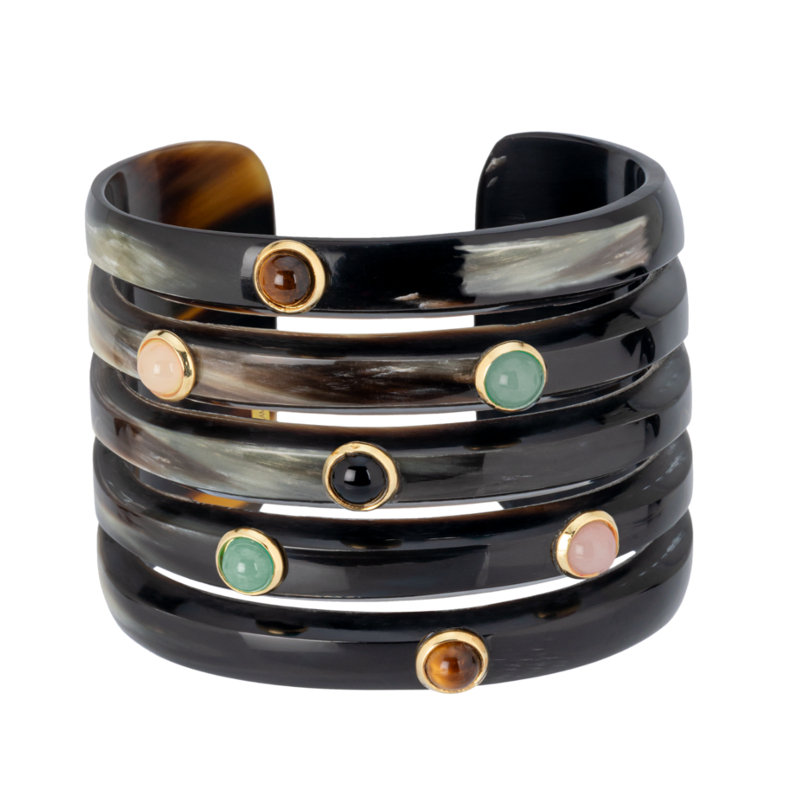 Horn, tiger´s eye, pink quartz, jade and onyx cuff.