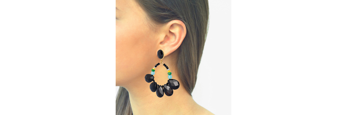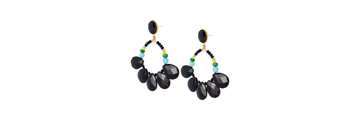 Pendientes Brianda con cristal de bohemia facetado, ágatas, jade y ónix facetado -Peso 14,5 g -Longitud 7,5 cm -Metal: acero bañado en oro -Negro -Al ser materiales naturales y estar trabajados a mano, pueden variar ligeramente en tamaño, forma y color.