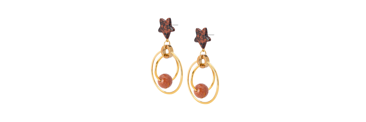 Pendientes aro Ada con hematite, y estrellas talladas de obsidiana caoba y aventurina. -Peso 10 g -Longitud 6,5 cm -Metal: acero bañado en oro -Marrón -Al ser materiales naturales y estar trabajados a mano, pueden variar ligeramente en tamaño, forma y color.