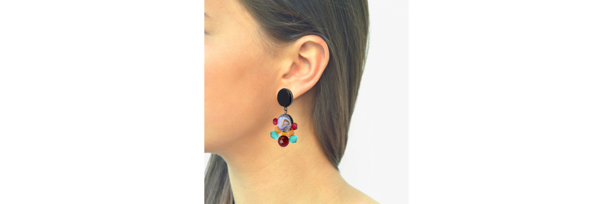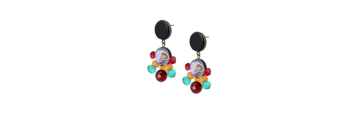 • Inna earrings with onyx, Bohemian crystal, agates, and abalon shell.