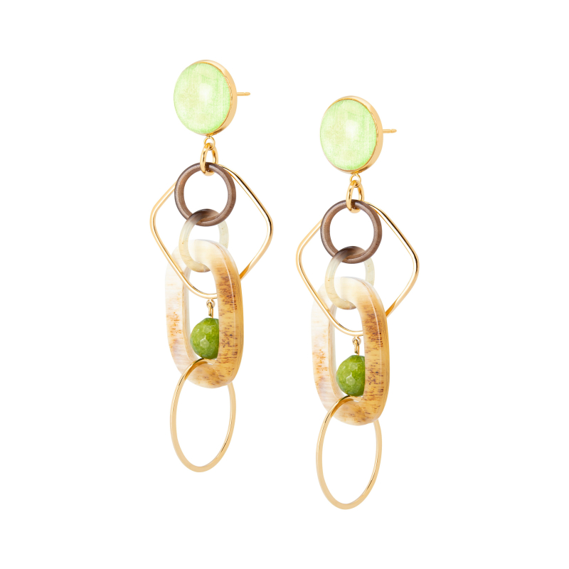 Pendientes Ayako con cuerno de búfalo, ágatas y cabujón de cristal de Bohemia pintado a mano. -Peso 5 g -Longitud 8,6 cm -Metal: acero bañado en oro -Verde/beige -Al ser materiales naturales y estar trabajados a mano, pueden variar ligeramente en tamaño, forma y color.