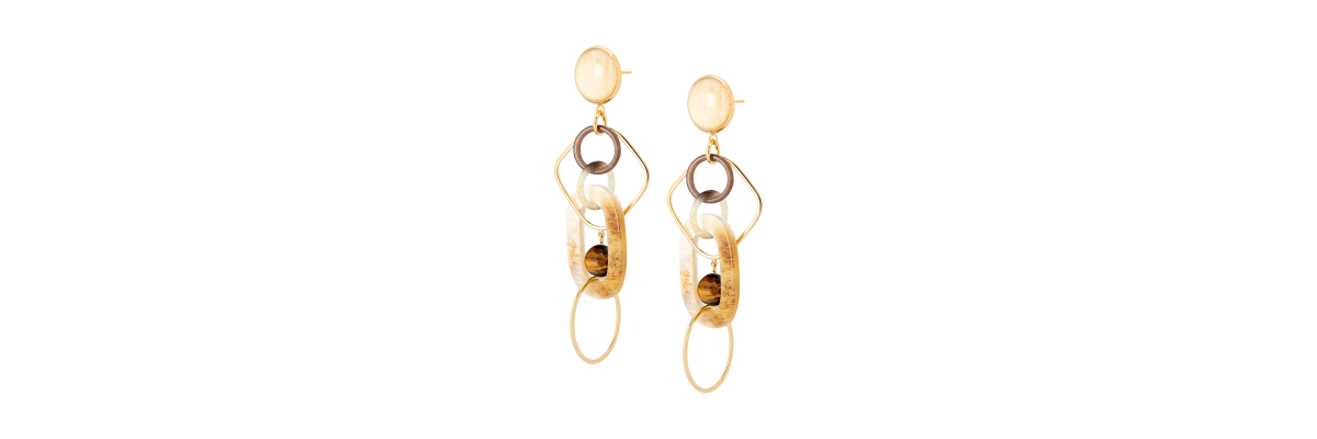 Pendientes Ayako con cuerno de búfalo, ágatas y cabujón de cristal de Bohemia pintado a mano. -Peso 5 g -Longitud 8,6 cm -Metal: acero bañado en oro -Marrón/beige -Al ser materiales naturales y estar trabajados a mano, pueden variar ligeramente en tamaño, forma y color.