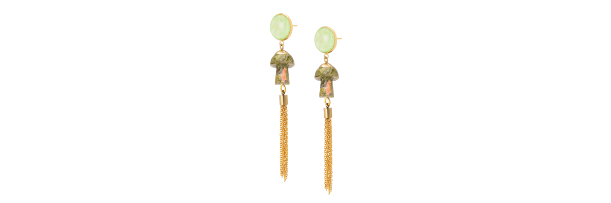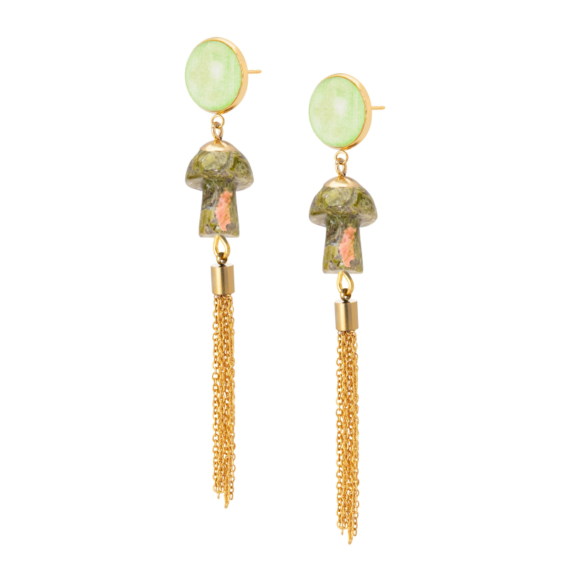 Pendientes Davinia con setas de unakita y borla de metal. -Peso 7,5 g -Longitud 5,5 cm -Metal: acero bañado en oro -Verde/dorado -Al ser materiales naturales y estar trabajados a mano, pueden variar ligeramente en tamaño, forma y color.