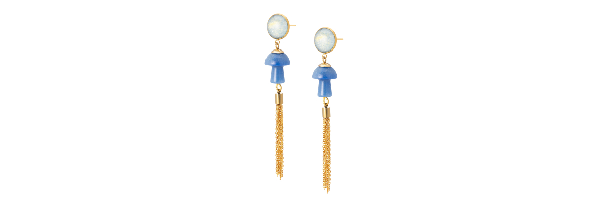 Pendientes Davinia con setas de ágata y borla de metal. -Peso 7,5 g -Longitud 5,5 cm -Metal: acero bañado en oro -Azul/dorado -Al ser materiales naturales y estar trabajados a mano, pueden variar ligeramente en tamaño, forma y color.