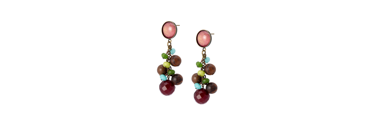 • Ingrid earrings with hand painted Bohemian cristal and wood and raspberry agates bunch.