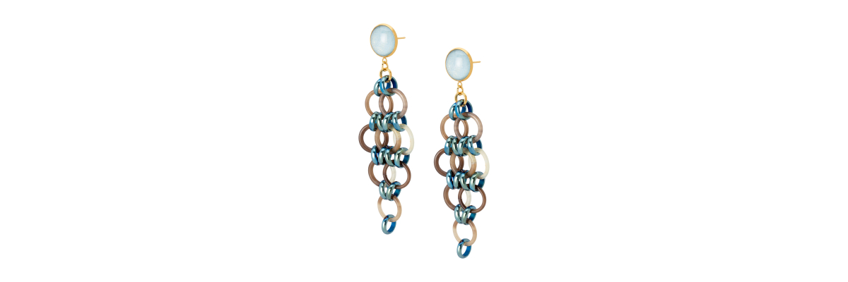 Pendientes Martina XL de cristal de Bohemia pintado a mano, cuerno de búfalo y aros de hematite. -Peso 7,5 g -Longitud 9,8 cm -Metal: acero bañado en oro -Azul -Al ser materiales naturales y estar trabajados a mano, pueden variar ligeramente en tamaño, forma y color.