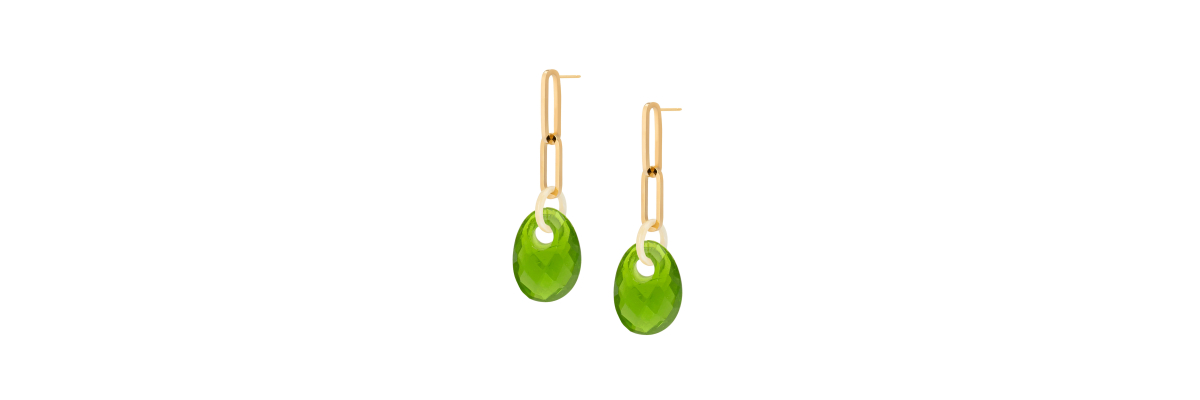 Pendientes Valentina con gota facetada de cristal de bohemia verde y cuerno de búfalo. -Peso 7,5 g -Longitud 6 cm -Metal: acero bañado en oro -Verde/dorado -Al ser materiales naturales y estar trabajados a mano, pueden variar ligeramente en tamaño, forma y color.