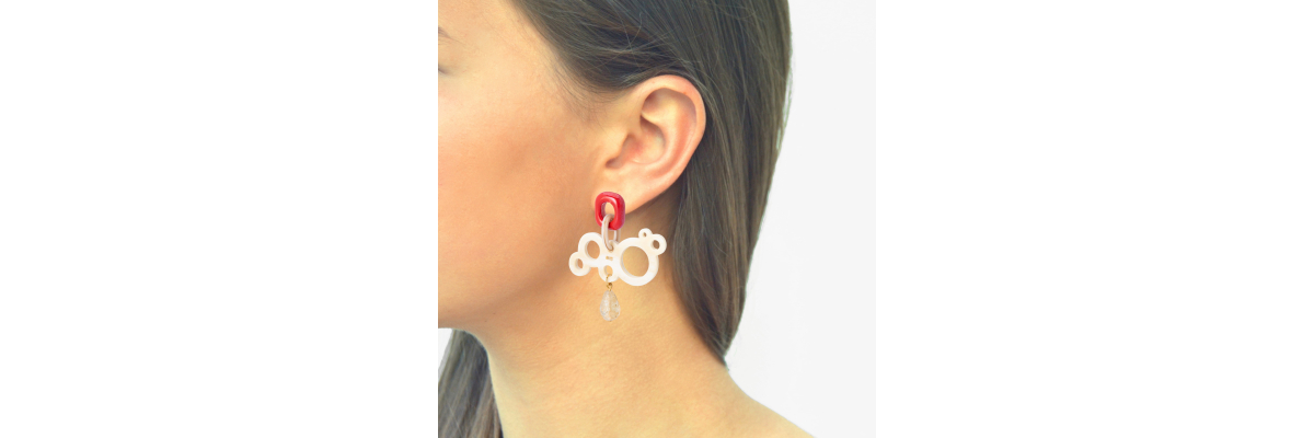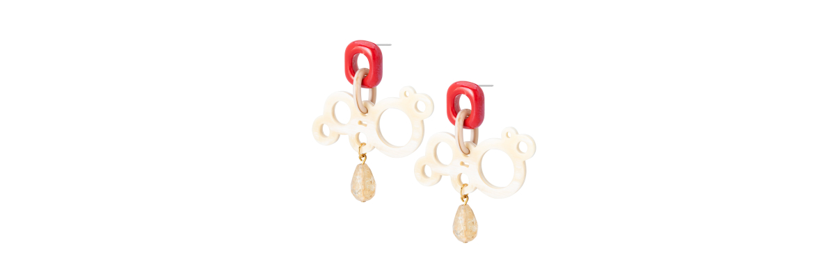• Buki earrings with ceramic, horn and a quartz teardrop.