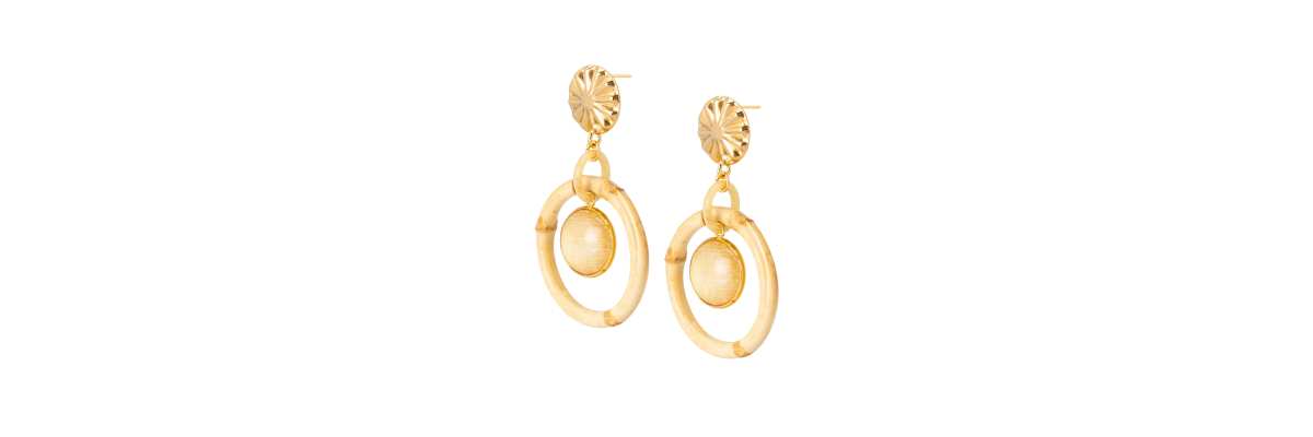 Pendientes Connie con aro de bambú, con flor pegada a la oreja y cabujón de cristal de Bohemia. -Peso 4,5 g -Longitud 6cm -Metal: acero bañado en oro -Al ser materiales naturales y estar trabajados a mano, pueden variar ligeramente en tamaño, forma y color.