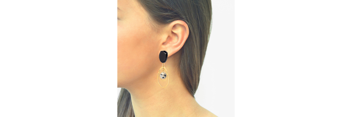 Pendientes Milo de cuerno facetado con doble aro irregular y piedra de jaspe dálmata. -Peso 8g -Longitud 5,6 cm -Metal: acero bañado en oro -Al ser materiales naturales y estar trabajados a mano, pueden variar ligeramente en tamaño, forma y color.