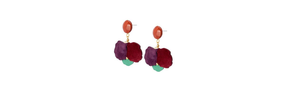Pendientes Kayla con una flor de ante de varios tonos y un jaspe rojo facetado -Peso 2,5 g -Longitud 5 cm -Metal: acero bañado en oro -Al ser materiales naturales y estar trabajados a mano, pueden variar ligeramente en tamaño, forma y co