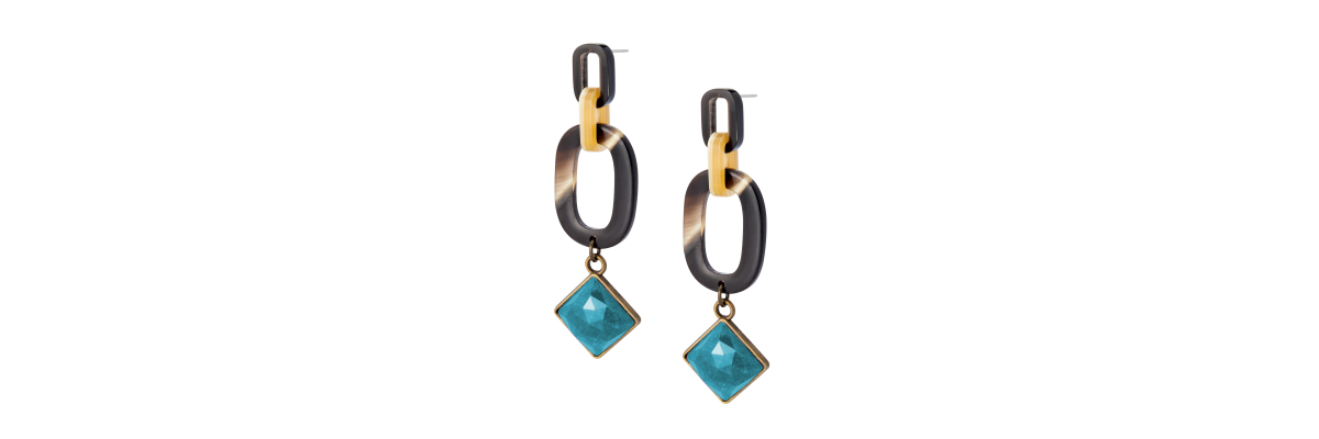 Pendientes Alba con eslabones de cuerno de distintos tamaños y un cabujón facetado de ágata color azul. -Peso 5 g -Longitud 7,5 cm -Metal: acero bañado en oro -Metal: old gold alloy and steel -Al ser materiales naturales y estar trabajados a mano, pueden variar ligeramente en tamaño, forma y color.