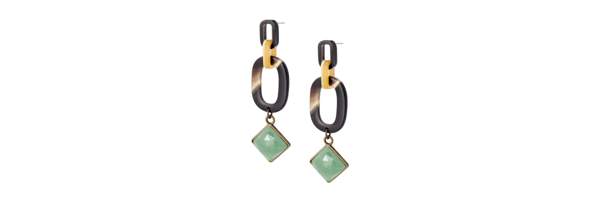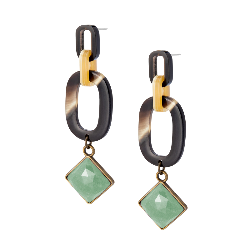 Pendientes Alba con eslabones de cuerno de distintos tamaños y un cabujón facetado de ágata color verde claro. -Peso 5 g -Longitud 7,5 cm -Metal: acero bañado en oro -Metal: old gold alloy and steel -Al ser materiales naturales y estar trabajados a mano, pueden variar ligeramente en tamaño, forma y color.