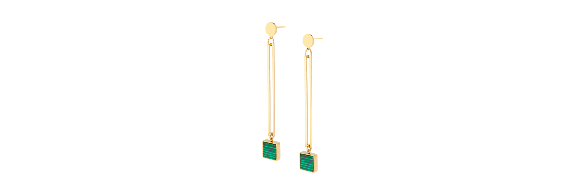 Pendientes Cecile largos con una rectángulo de acero bañado en oro y malaquita. -Peso 6 g -Longitud 7,5 cm -Metal: acero bañado en oro -Al ser materiales naturales y estar trabajados a mano, pueden variar ligeramente en tamaño, forma y color.