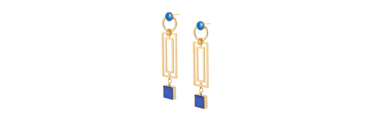 Pendientes Cecile largos con una rectángulo doble de acero bañado en oro y lapislázuli. -Peso 8 g -Longitud 8,5 cm -Metal: acero bañado en oro -Al ser materiales naturales y estar trabajados a mano, pueden variar ligeramente en tamaño, forma y color.