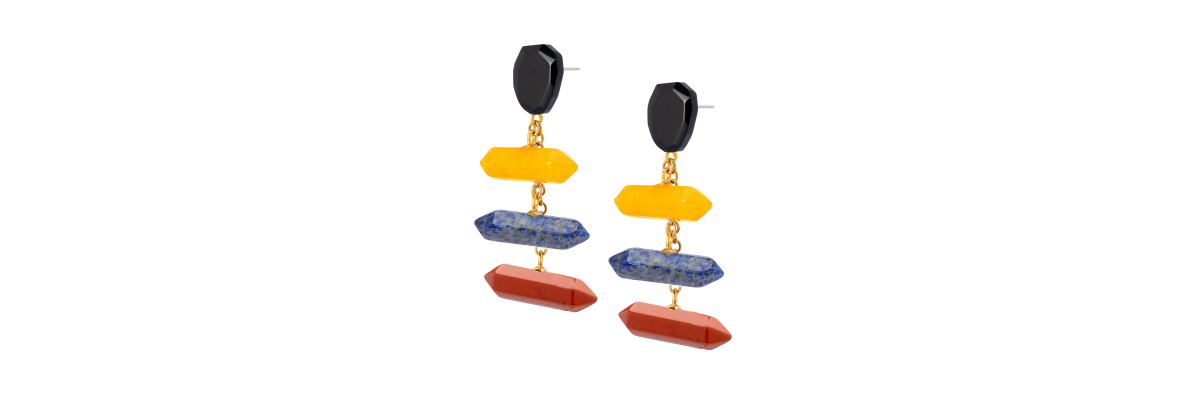Pendientes Sofía con cuerno de búfalo de forma irregular y tres barras de ágata, lapislázuli y jaspe rojo. -Peso 15 g -Longitud 6,5 cm -Metal: acero bañado en oro -Color amarillo, azul y rojo anaranjado -Al ser materiales naturales y estar trabajados a mano, pueden variar ligeramente en tamaño, forma y color.