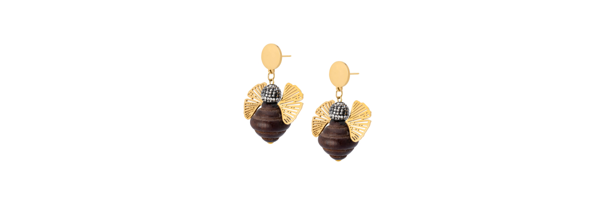 Pendientes Maia con una abeja de madera de ébano y hematite. Las alas son una filigrana de acero bañado en oro. -Peso 6 g -Longitud 4,8 cm -Metal: acero bañado en oro -Al ser materiales naturales y estar trabajados a mano, pueden variar ligeramente en tamaño, forma y color.