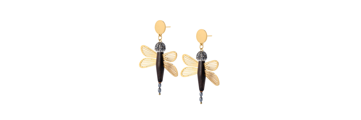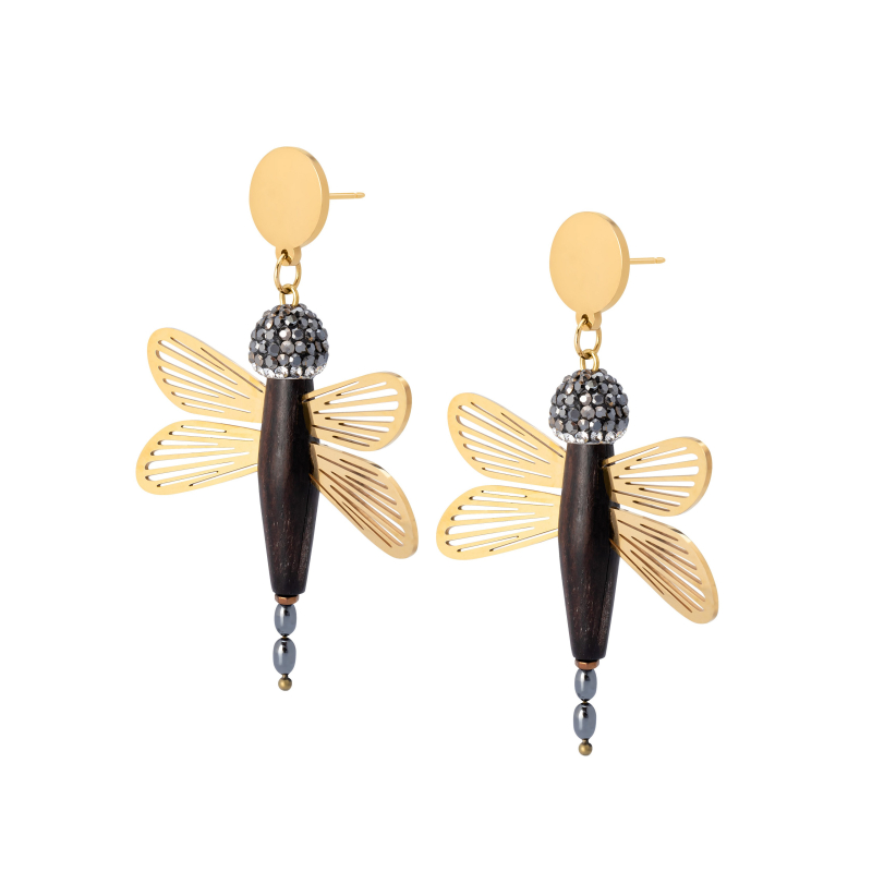 Pendientes Maia con una libélula de madera de ébano y hematite. Las alas son una filigrana de acero bañado en oro. -Peso 7 g -Longitud 6,5 cm -Metal: acero bañado en oro -Al ser materiales naturales y estar trabajados a mano, pueden variar ligeramente en tamaño, forma y color.