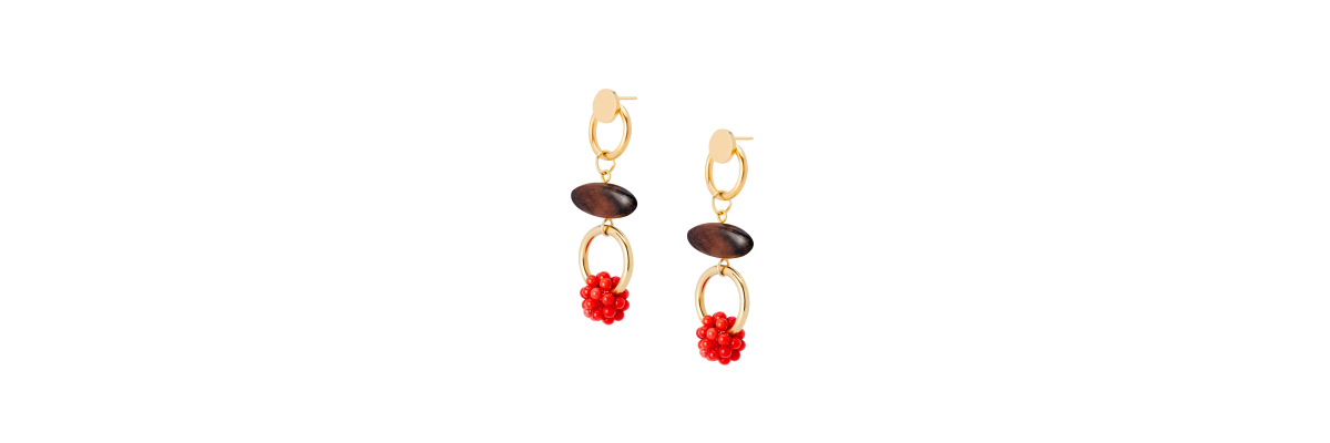 Pendientes Amarella con madera de ébano, aro y una esfera tejida de coral rojo. -Peso 5,5 g -Longitud 5,5 cm -Metal: acero bañado en oro -Al ser materiales naturales y estar trabajados a mano, pueden variar ligeramente en tamaño, forma y color.