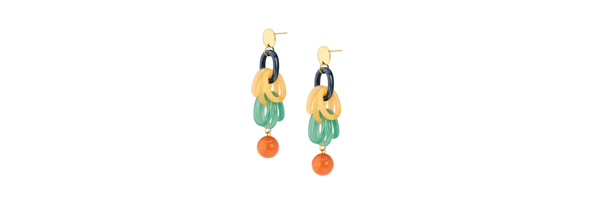 Pendientes Ambra con eslabones de resina al agua de diferentes colores y una bola de ágata. -Peso 5 g -Longitud 6,5 cm -Metal: acero bañado en oro -Al ser materiales naturales y estar trabajados a mano, pueden variar ligeramente en tamaño, forma y color.