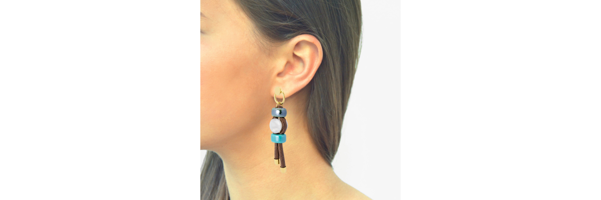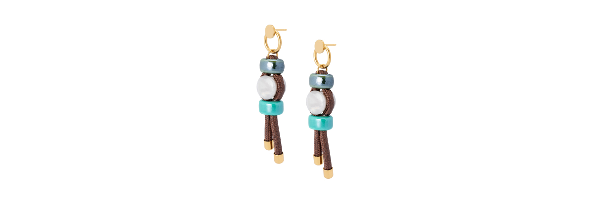 Pendientes Piero con ágata blanca, cerámica en dos tonos y cordón de algodón marrón chocolate. -Peso 12 g -Longitud 8 cm -Metal: acero bañado en oro -Al ser materiales naturales y estar trabajados a mano, pueden variar ligeramente en tamaño, forma y color.