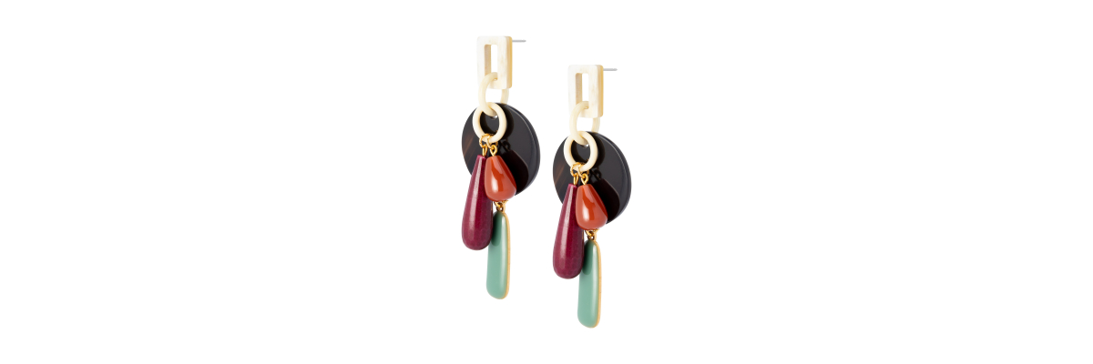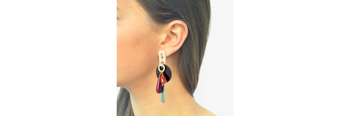 Pendientes Atria con con cuerno y tres colgantes de ágata cornalina y esmalte. -Peso 11 g -Longitud 8 cm -Metal: acero bañado en oro -Al ser materiales naturales y estar trabajados a mano, pueden variar ligeramente en tamaño, forma y color.