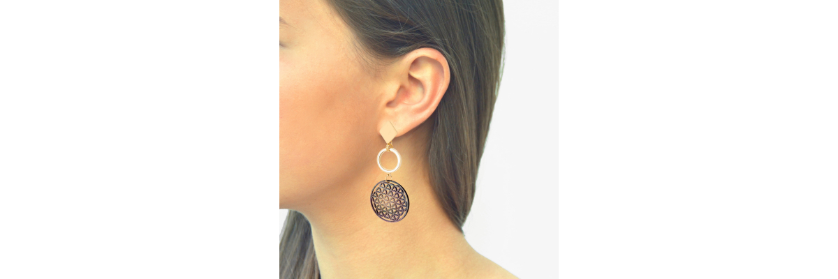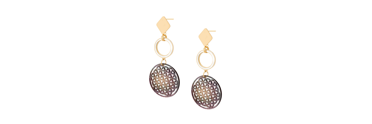 Pendientes largos Anna con tres partes de acero bañado en oro y nácar calado. -Peso 5 g -Longitud 6,3 cm -Metal: acero bañado en oro -Al ser materiales naturales y estar trabajados a mano, pueden variar ligeramente en tamaño, forma y color.