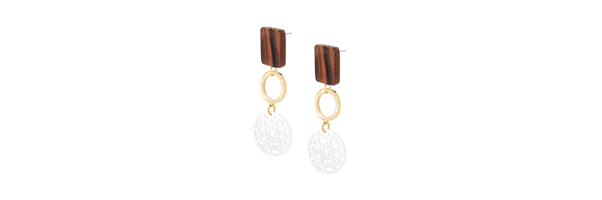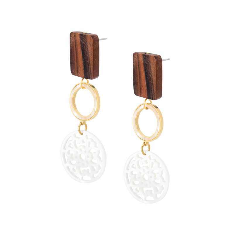 Pendientes con rectángulo de madera d eábano y medalla de nácar calado. -Peso 5 g -Longitud 7 cm -Metal: acero bañado en oro -Al ser materiales naturales y estar trabajados a mano, pueden variar ligeramente en tamaño, forma y color.