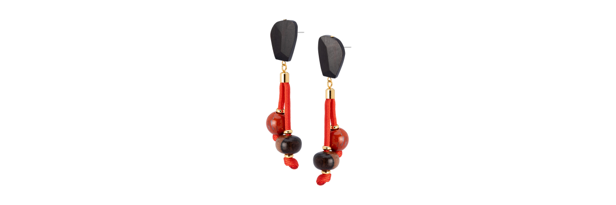 Pendientes Livia de madera de ébano y jaspe rojo, en cordón textil anudado rojo. -Peso 10,5 g -Longitud 9,5 cm -Metal: acero bañado en oro -Rojo/marrón -Al ser materiales naturales y estar trabajados a mano, pueden variar ligeramente en tamaño, forma y color.