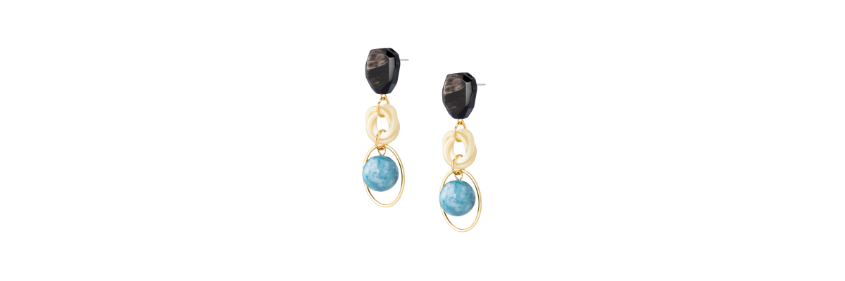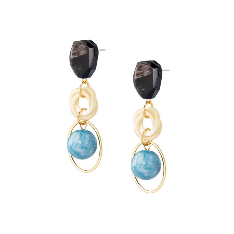 Pendientes Manny con cuerno de búfalo y ágatas celestes. -Peso 6 g -Longitud 6 cm -Metal: acero bañado en oro -Azul/negro -Al ser materiales naturales y estar trabajados a mano, pueden variar ligeramente en tamaño, forma y color.