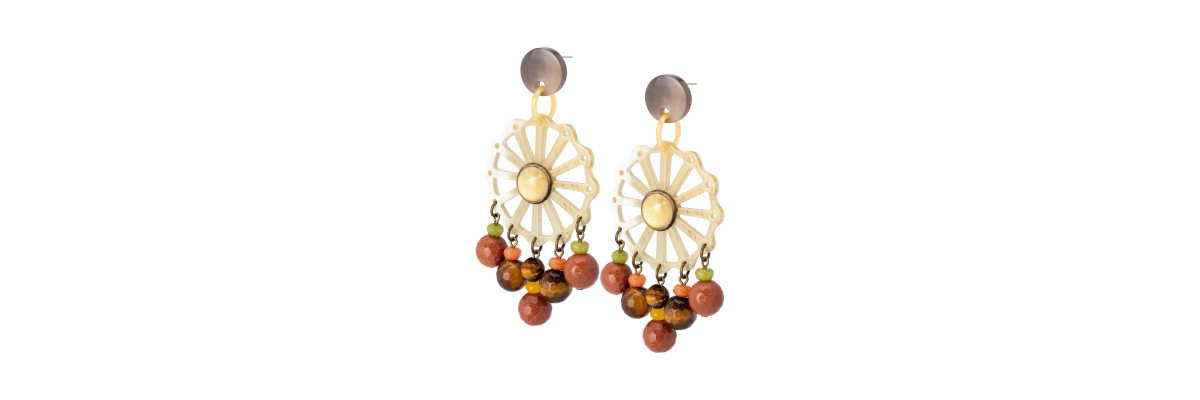 Pendientes Claudia grandes con cornalina, ágatas, ojo de tigre, aventurina, cuerno de búfalo y cristal de Bohemia. -Peso 18 g -Longitud 9 cm -Metal: aleación dorado viejo -Naranja/amarillo/verde/marrón -Al ser materiales naturales y estar trabajados a mano, pueden variar ligeramente en tamaño, forma y color.