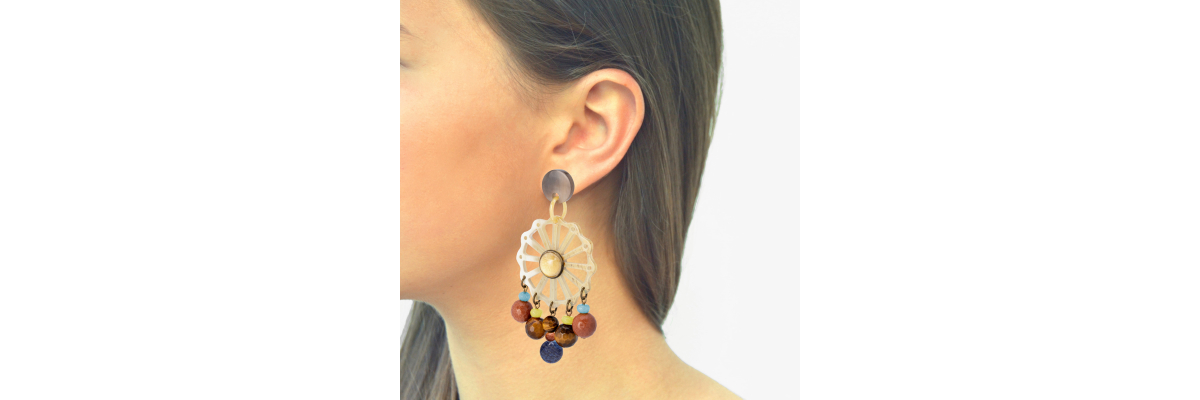• Claudia rounded earrings with lapis, agates, aventurine, tiger's eye, buffalo horn and Bohemian crystal.