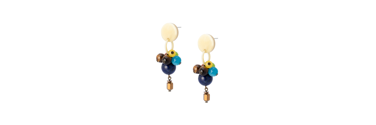 Pendientes Claudia con lapislázuli, ágatas, ojo de tigre, aventurina, cuerno de búfalo y hematite. -Peso 7,8 g -Longitud 5,5 cm -Metal: aleación dorado viejo -Azul/amarillo/marrón -Al ser materiales naturales y estar trabajados a mano, pueden variar ligeramente en tamaño, forma y color.