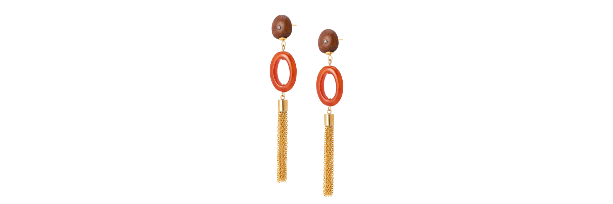 Pendientes Erin con base de madera de ébano, óvalo de cornalina y borla de metal. -Peso 5,8 g -Longitud 9,5 cm -Metal: acero bañado en oro -Naranja/marrón -Al ser materiales naturales y estar trabajados a mano, pueden variar ligeramente en tamaño, forma y color.