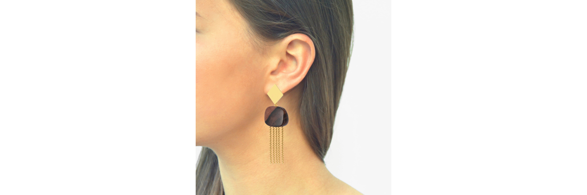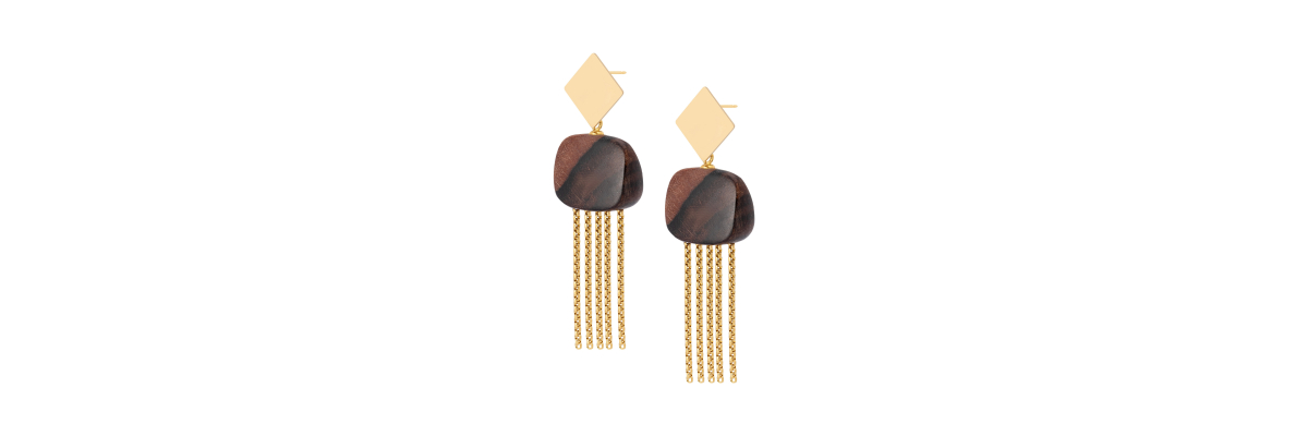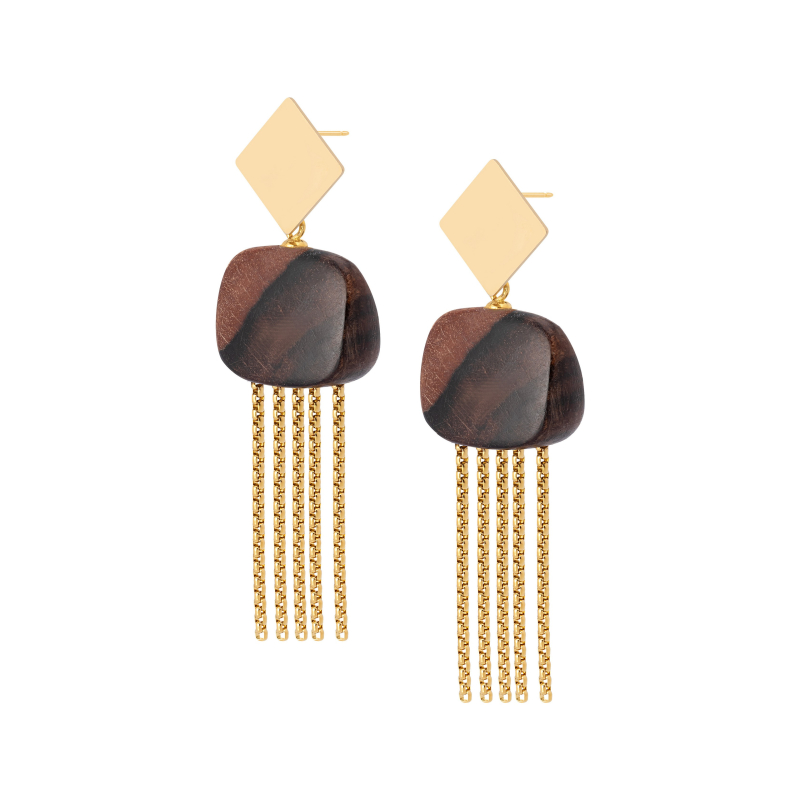 Pendientes Erin con flecos de metal incrustada en pieza de ébano. -Peso 7,6 g -Longitud 8 cm -Metal: acero bañado en oro -Marrón -Al ser materiales naturales y estar trabajados a mano, pueden variar ligeramente en tamaño, forma y color.