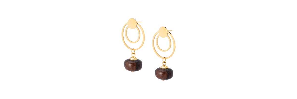 Pendientes Erin triple aro de metal y pieza de ébano. -Peso 5 g -Longitud 5 cm -Metal: acero bañado en oro -Marrón -Al ser materiales naturales y estar trabajados a mano, pueden variar ligeramente en tamaño, forma y color.