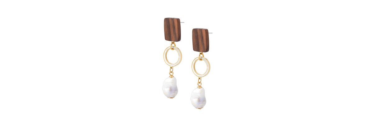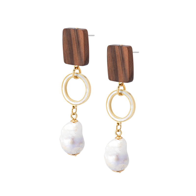 • Bel earrings with ebony, mother of pearl, and baroque fresh water pearls.