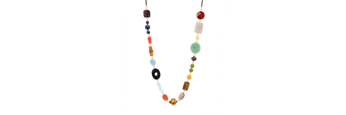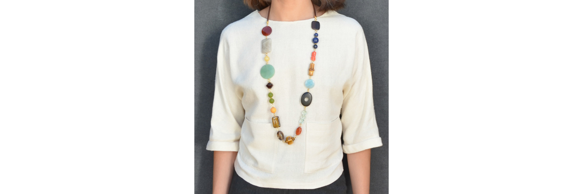 Collar largo Amina que combina diferentes materiales y formas, con piedras semipreciosas como cornalina, jade, ojo de hierro, jaspe rojo o lapislázuli, además de coral, bambú, cerámica y madera de ébano. Está terminado en el cuello con un cordón de algodón marrón chocolate.
