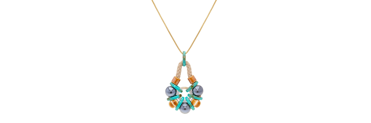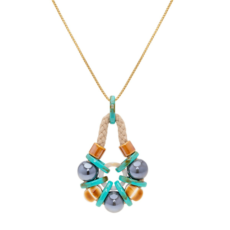 • Duna necklace with a round pendant in ceramic, resin and mother of pearl, held in a light taupe cotton cord.