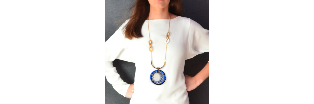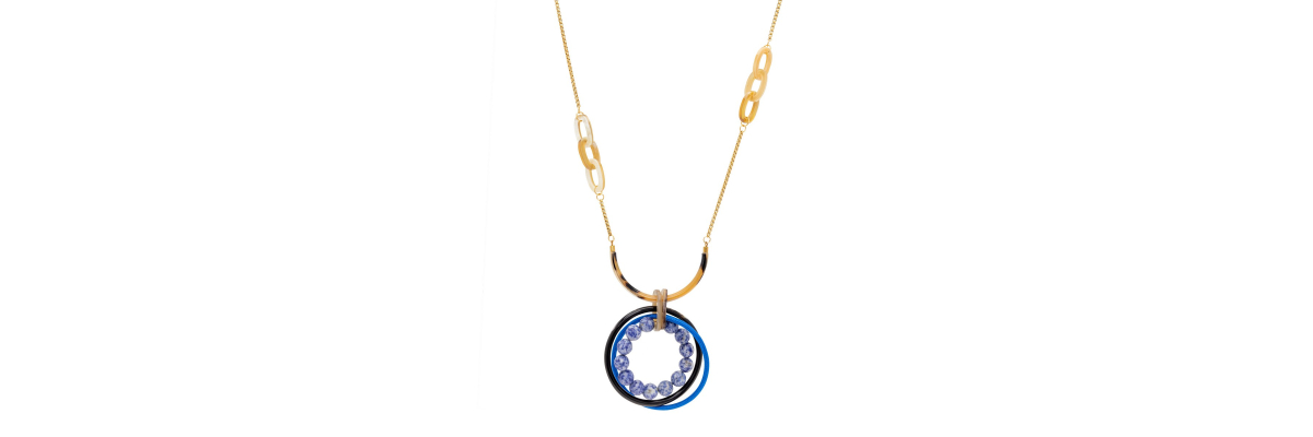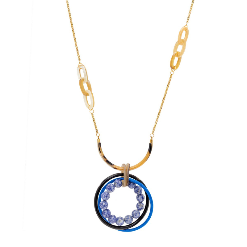 Collar Olimpic de cadena de caja con eslabones de cuerno y aros entrelazados de cordón textil azul, cuerno y sodalita. -Peso 70 g -Longitud 47 cm -Metal: acero bañado en oro -Color azul, blanco, beige -Al ser materiales naturales y estar trabajados a mano, pueden variar ligeramente en tamaño, forma y color.