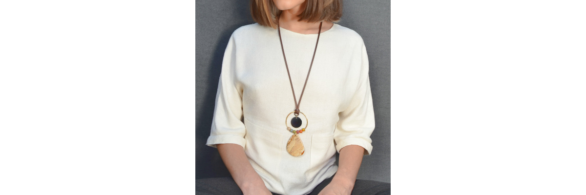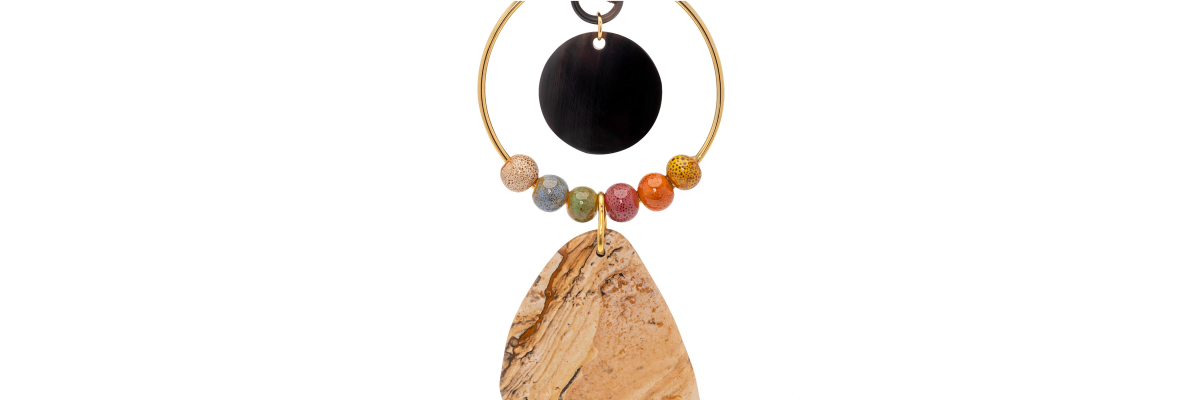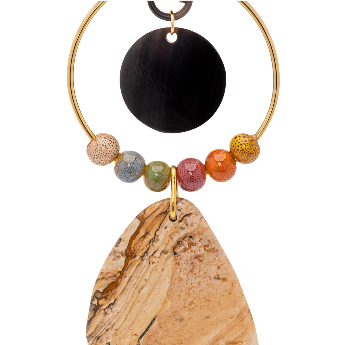 Collar Leonardo con colgante de cuerno, cerámica multicolor y jaspe paisaje, cogido al cuello con un cordón de algodón marrón chocolate. -Peso 49 g -Longitud 48,5 cm -Metal: acero bañado en oro -Al ser materiales naturales y estar trabajados a mano, pueden variar ligeramente en tamaño, forma y color.