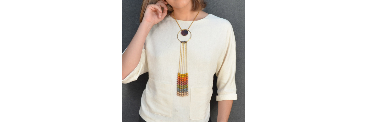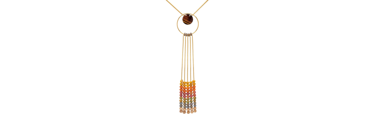 Collar Leonardo en forma de Y con cuerno, flecos de cadena y cerámica multicolor. -Peso 79 g -Longitud 48 cm -Metal: acero bañado en oro -Al ser materiales naturales y estar trabajados a mano, pueden variar ligeramente en tamaño, forma y color.