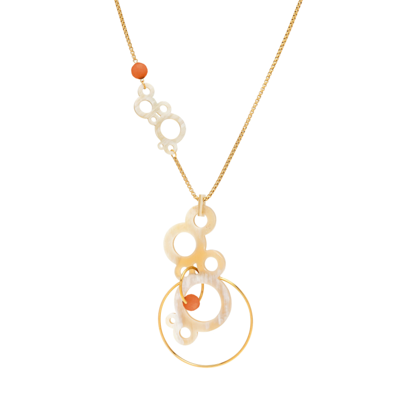 Collar Daria asimétrico con piezas de cuerno con un diseño de burbujas en distintos tamaños, en una larga cadena tipo caja. El color lo ponen las ágatas de distintos colores. -Peso 50 g -Longitud 49 cm -Metal: acero bañado en oro -Al ser materiales naturales y estar trabajados a mano, pueden variar ligeramente en tamaño, forma y color.