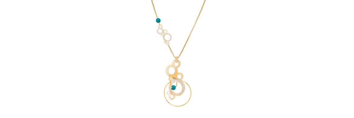 Collar Daria asimétrico con piezas de cuerno con un diseño de burbujas en distintos tamaños, en una larga cadena tipo caja. El color lo ponen las ágatas de distintos colores. -Peso 50 g -Longitud 49 cm -Metal: acero bañado en oro -Al ser materiales naturales y estar trabajados a mano, pueden variar ligeramente en tamaño, forma y color.