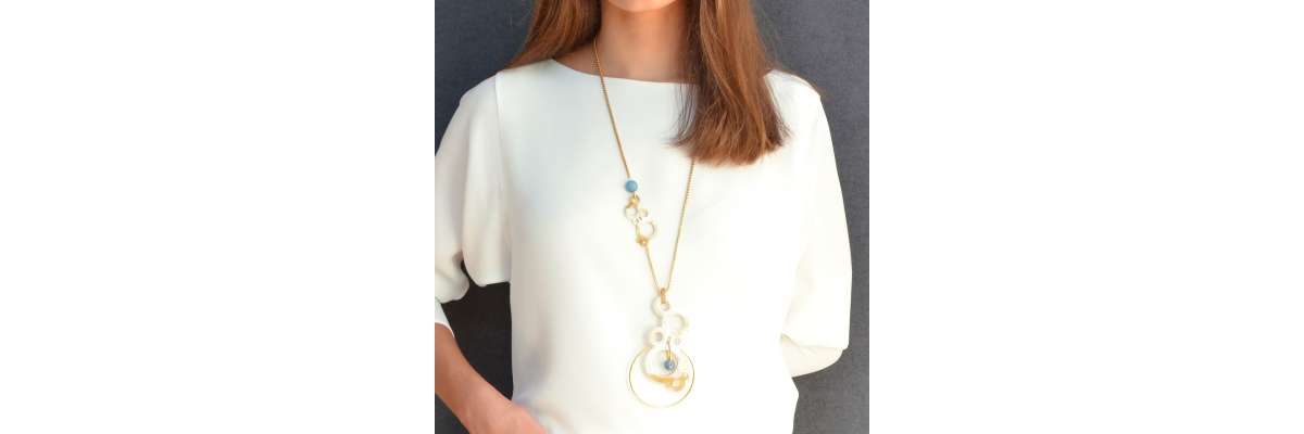 • Asymmetrical Daria necklace with agates and a bubble design in horn. It is mounted on a long box type chain.