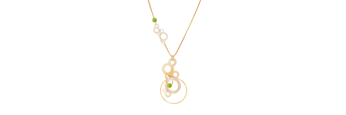 Collar Daria asimétrico con piezas de cuerno con un diseño de burbujas en distintos tamaños, en una larga cadena tipo caja. El color lo ponen las ágatas de distintos colores. -Peso 50 g -Longitud 49 cm -Metal: acero bañado en oro -Al ser materiales naturales y estar trabajados a mano, pueden variar ligeramente en tamaño, forma y color.